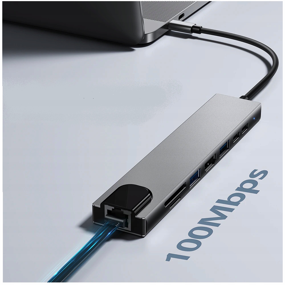 HUB Przejściówka USB-C ADAPTER 8w1 z portami: Display Port 8K 60Hz / 4K 144 Hz, 2x USB, SD i micro SD, FAST Ethernet, Power Delivery 3.0 100W